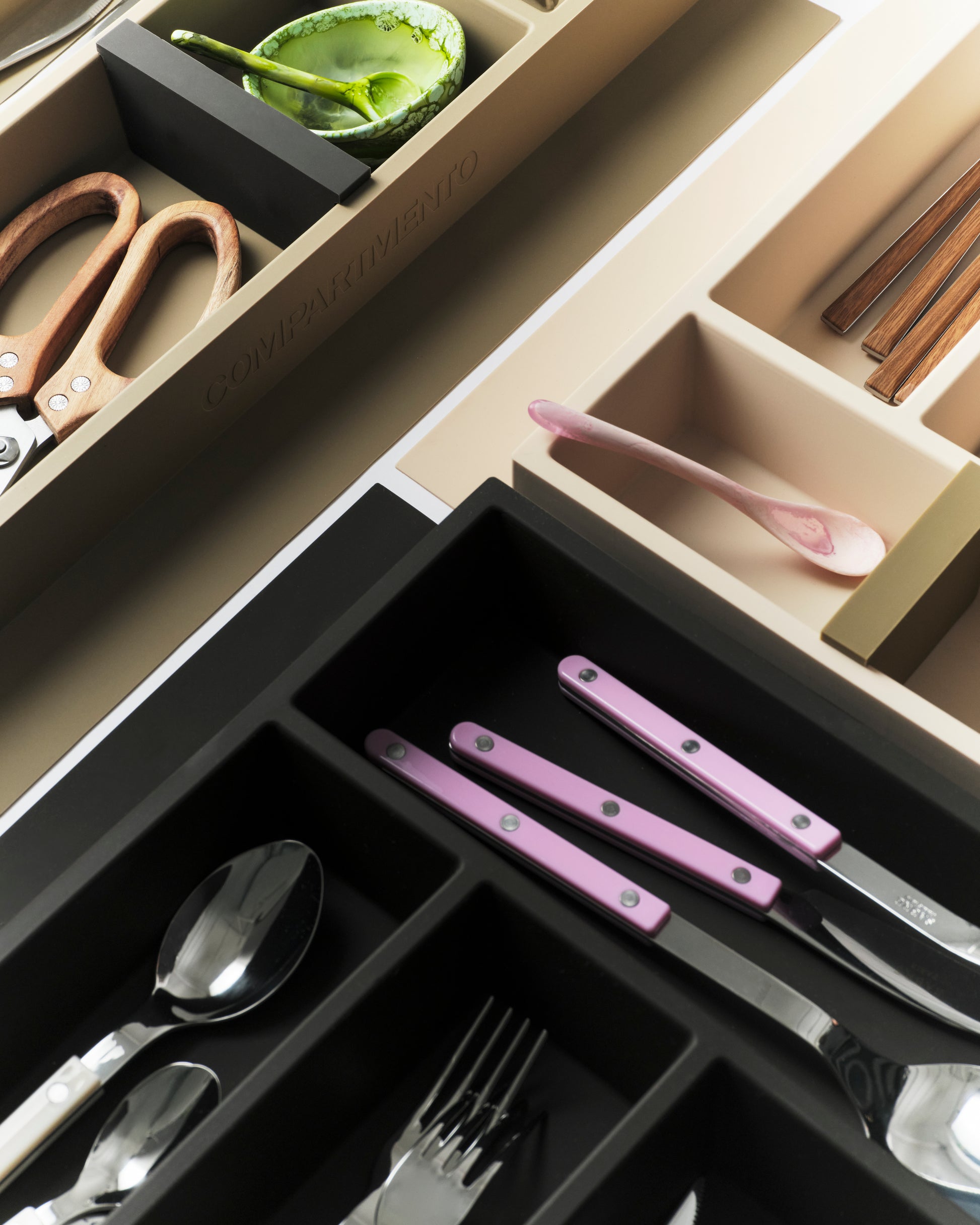 Each COMPARTMENTO Vide inlay has been designed in a straightforward manner to encourage the clever, effortless partition and placement of cutlery and utensils within the kitchen drawer.